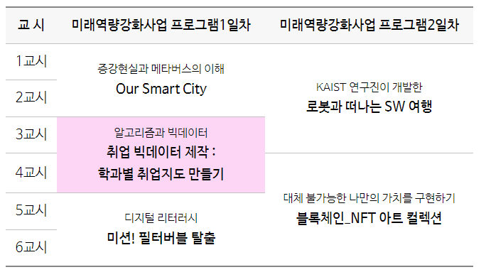 ȲÁöÁ¤º¸»ê¾÷°íµîÇб³¿¡¼ÀÇ °úÁ¤Àº ÀüÇгâ ÇлýµéÀÇ µðÁöÅÐ ½Ã¹Î¿ª·®°ú µðÁöÅРȰ¿ë, À¶ÇÕ¿ª·®À» °ÈÇÒ ¼ö ÀÖµµ·Ï Ä¿¸®Å§·³ÀÌ ±¸¼ºµÇ¾ú½À´Ï´Ù. 2Àϵ¿¾È ÃÑ 5°³ÀÇ °úÁ¤À» ÁøÇàÇÏ¸é¼ ÇлýµéÀÌ ¸¸Á·ÇÒ ¼ö ÀÖ´Â ÇлýÂü¿©Çü¼ö¾÷, Ȱµ¿Á߽ɼö¾÷À¸·Î ±¸¼ºµÇ¾ú½À´Ï´Ù. 5°³ÀÇ °úÁ¤ À̿ܿ¡µµ ´Ù¾çÇÑ 4Â÷»ê¾÷ ±â¼úÀ» Ȱ¿ëÇÑ ¹Ì·¡¿ª·®°È±³À°À» ÁøÇàÇϰí ÀÖ½À´Ï´Ù.