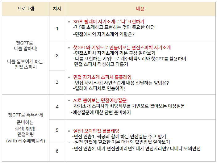 Á¤¼®Ç×°ø°úÇаíµîÇб³ÀÇ °úÁ¤Àº »ý¼ºÇü AI¿Í ÇÔ²²ÇÏ´Â ÀÚ±â¼Ò°³¼ ÀÛ¼º °úÁ¤°ú ½ÇÀü ¸éÁ¢ Áغñ °úÁ¤À¸·Î Á¤¼®Ç×°ø°úÇаíµîÇб³ 2Çгâ ÇлýµéÀÇ Ãë¾÷¿ª·®À» °ÈÇϱâ À§ÇØ Áغñ µÇ¾ú½À´Ï´Ù. »ý¼ºÇü AI¸¦ Ȱ¿ëÇÏ¿© ³ªÀÇ ¿ª·®À» È®ÀÎÇØº¸°í ³ª¸¸ÀÇ ÀÚ±â¼Ò°³¼¸¦ ÀÛ¼ºÇÑ ÈÄ ¸éÁ¢¿¡¼ ÀÚÀ¯·Ó°Ô ³ªÀÇ ¿ª·®À» Ç¥ÇöÇÒ ¼ö ÀÖ´Â ¸éÁ¢ ½ºÇÇÄ¡¸¦ À§ÇØ ¾Æ¿ö½ºÅ丮¸¸ÀÇ Â÷º°ÈµÈ '·¹ÁÖ¸ÞÆÑÅ丮' ¼Ö·ç¼ÇÀ» ÀÌ¿ëÇÏ¿© ¸éÁ¢ ½ºÇÇÄ¡¸¦ ¿¬½ÀÇÕ´Ï´Ù.
