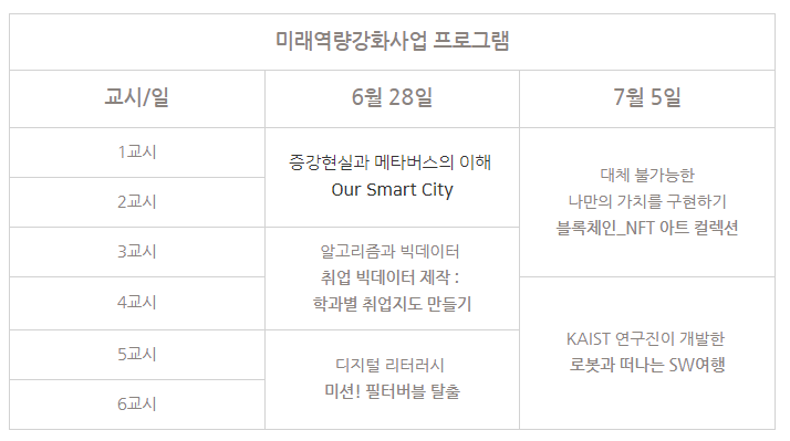 ¸¹Àº ¹Ì·¡¿ª·®±³À°À» ÁøÇàÇϸç ÇлýµéÀÌ ÁÖµµÀûÀ¸·Î Âü¿©ÇÏ°í »ý°¢ÇÒ ¼ö ÀÖµµ·Ï ±¸¼ºµÈ ´ëÇ¥ °úÁ¤µé·Î 4Â÷»ê¾÷ÀÇ ´ëÇ¥ÀûÀÎ ±â¼úÀÎ ºí·ÏüÀÎ, ¸ÞŸ¹ö½º, ·Îº¿ ±×¸®°í ¾Ë°í¸®Áò, ºòµ¥ÀÌÅÍ ±îÁö ÀÌÇØÇÒ ¼ö ÀÖ´Â ÇÁ·Î±×·¥°ú Ȱµ¿ ±×¸®°í µðÁöÅÐ ¸®ÅÍ·¯½Ã±îÁö ¾ËÂù °úÁ¤À¸·Î ±¸¼ºµÇ¾ú½À´Ï´Ù.