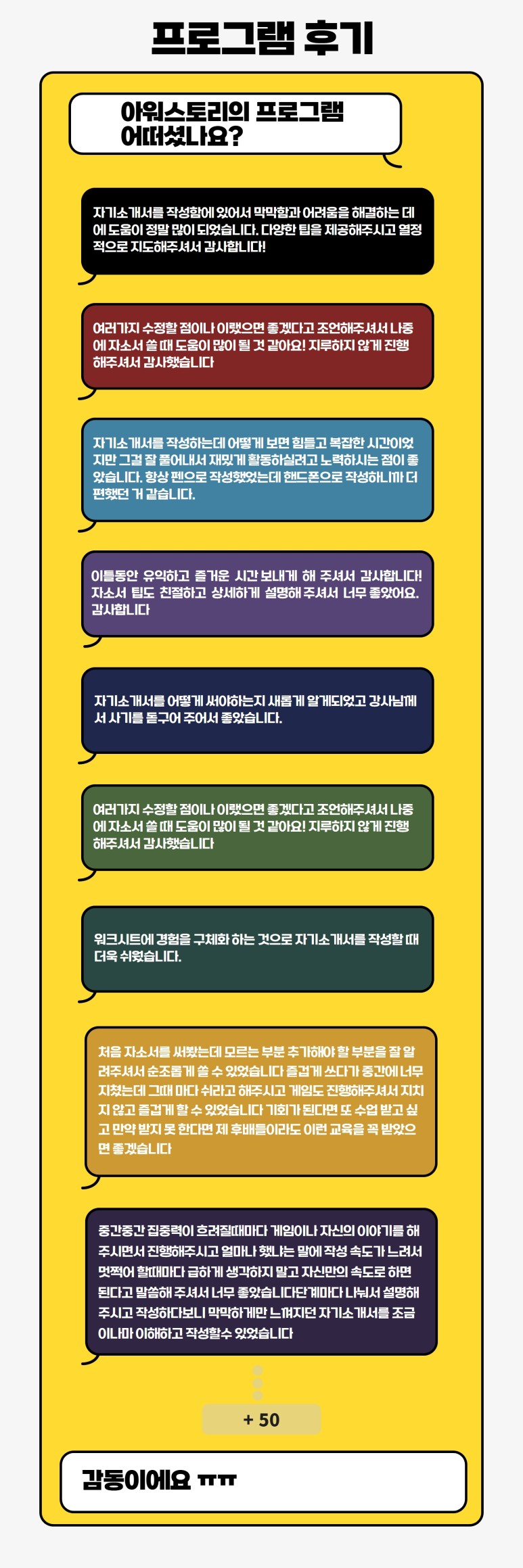 À̹ø ±³À°Àº ´ÏÁî¿¡µµ Ãæ½ÇÇßÁö¸¸ Æ÷Ä¿½º¿¡ ÁýÁßÇÑ [¿Ï¼ºµµ ³ôÀº ³ª¸¸ÀÇ ÀÚ±â¼Ò°³¼ ¸¸µé±â]¸¦ ÁøÇàÇÏ¿© ¼¼ºÐÈµÈ ÇÁ·Î±×·¥ ¸¸Á·µµ¸¦ º¸±â ¾î·Á¿üÀ¸³ª ÇÁ·Î±×·¥ÀÇ Èıâ·Î ÃæºÐÈ÷ ¸¸Á·Çß´Ù´Â °ÍÀ» ´À³¥ ¼ö ÀÖ¾ú½À´Ï´Ù.