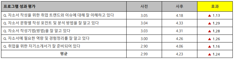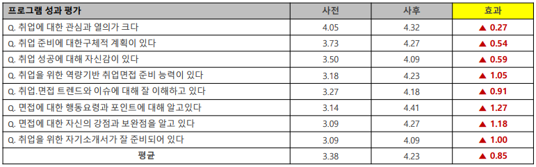 ÀÚ±â¼Ò°³¼ ÇÁ·Î±×·¥À» ÁøÇàÇϱâ Àü »çÀü¿¡ Á¶»çÇß´ø Á¡¼ö¿Í ÁøÇà ÈÄ Á¡¼ö°¡ »ó´çÈ÷ ¿Ã¶ó°¬´Ù´Â °ÍÀ» º¼ ¼ö ÀÖ½À´Ï´Ù.