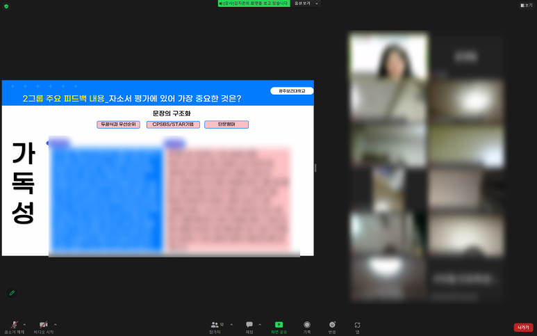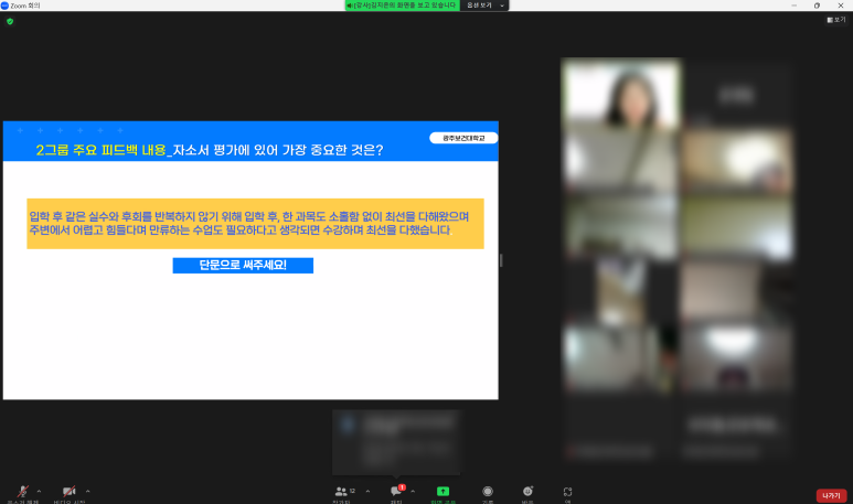 ´ã´ç °»ç´ÔµéÀÌ ÁýÁßÇÏ¿© Çǵå¹é ÁÙ ¼ö ÀÖµµ·Ï ¼Ò±Ô¸ð·Î ±×·ìÇÎÇÏ¿© ÃÑ 12 ±×·ìÀ¸·Î ÁøÇàµÈ ±¤ÁÖº¸°Ç´ëÇб³ ÀÚ¼Ò¼ ÇÁ·Î±×·¥Àº À̿Ͱ°Àº Çǵå¹éÀ» ¹ÞÀ» ¼ö ÀÖ¾ú´ø ¸¸Å ÇлýµéÀÇ ±àÁ¤ÀûÀÎ ¸¸Á·µµ¸¦ ¾òÀ» ¼ö ÀÖ¾ú½À´Ï´Ù. °³º°ÀûÀ¸·Î ÀÚ±â¼Ò°³¼¸¦ ÷»èÇϰí Çǵå¹é Ư°À» ÅëÇØ ÀÚ±â¼Ò°³¼¸¦ ¿Ï¼ºÇÒ ¼ö ÀÖµµ·Ï ÇÏ¿© Ư°À» µéÀº ÇлýµéÀÌ ÃæºÐÈ÷ ¾ò¾î°¥ ¼ö ÀÖµµ·Ï ÁøÇàÇÏ¿´½À´Ï´Ù.